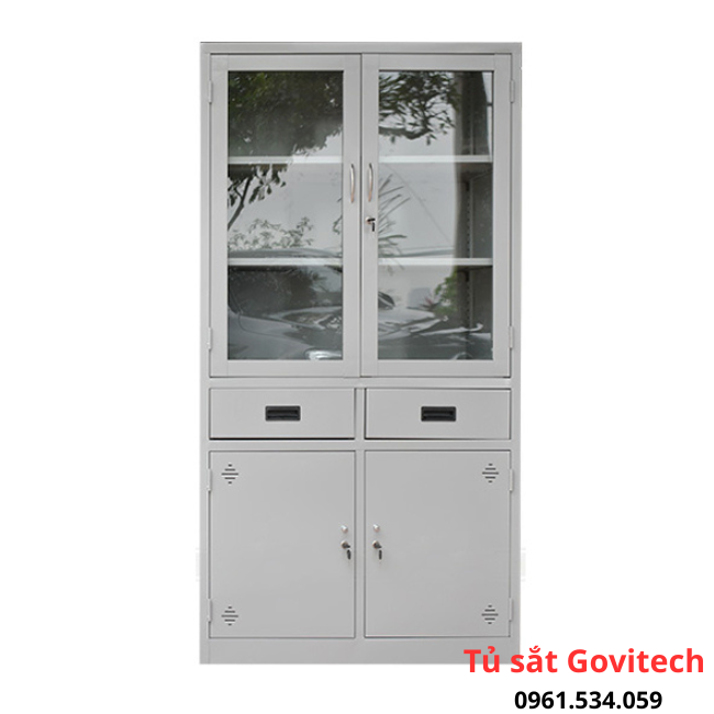 – Khoang cánh kính có 2 đợt di động chia khoang làm 3 ngăn để đồ, tài liệu, hồ sơ. Tay nắm mạ và 01 khóa locker