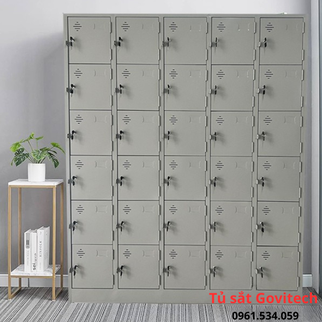 Tủ sắt nguyên khối vững chắc, chia thành 5 cột, 6 hàng, 30 ô. Cao 240 x Rộng 300 x Sâu 430 (mm) bằng nhau, có thể để vừa túi xách, giày dép. Cánh sắt mở, trên mỗi cánh có trang bị khóa locker (hay còn gọi là khóa bảo mật, cực kỳ an toàn, tỷ lệ trùng chìa khóa là 1/12000 – hầu như không có) và bảng tên nhân viên. Ngoài ra, tủ còn có tai móc khóa để dùng trường hợp cần thêm ổ khóa ngoài. Cánh tủ có ô thoáng gió.